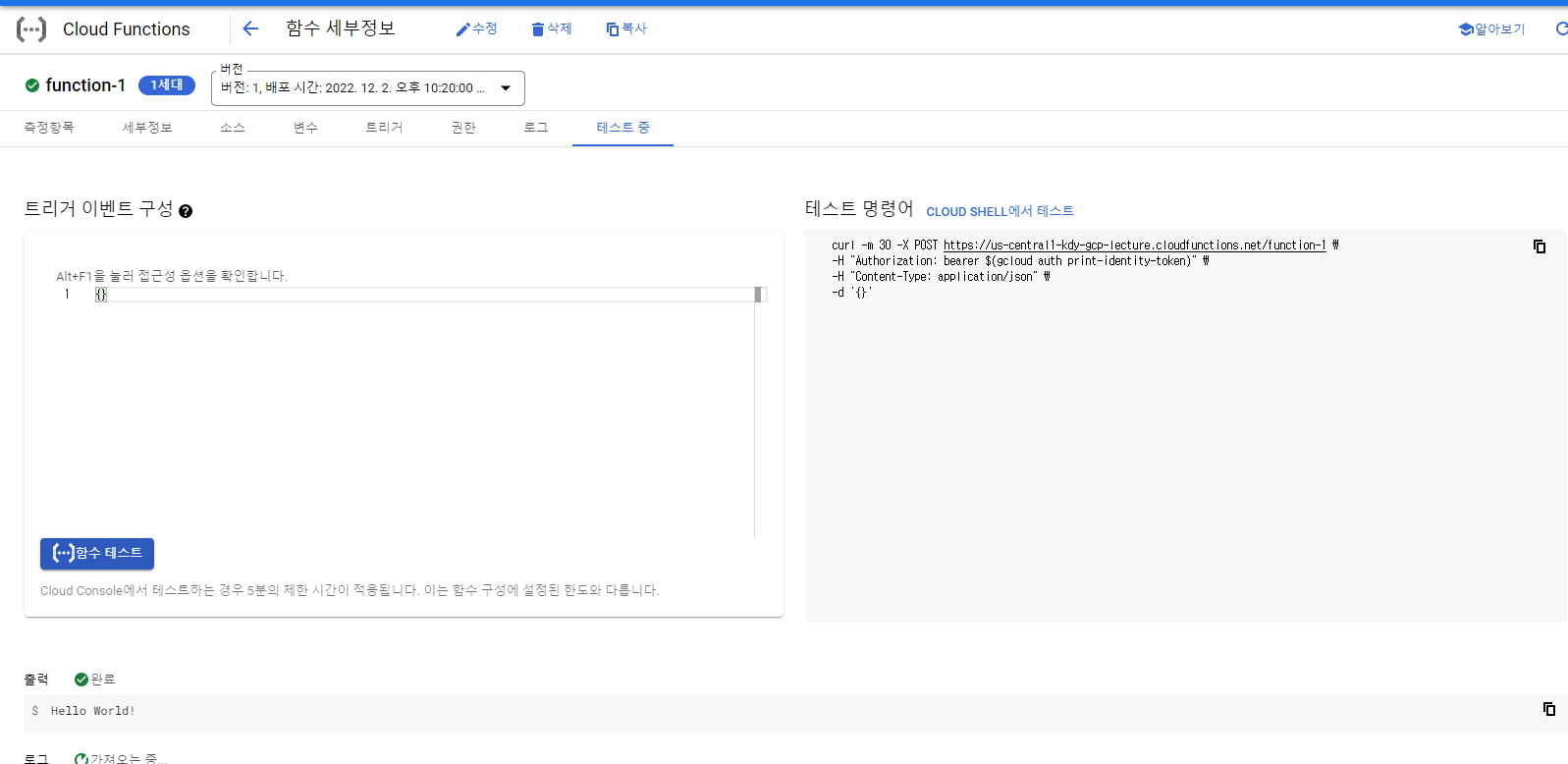 함수 테스트를 해보면 Hello World 가 뜬다.