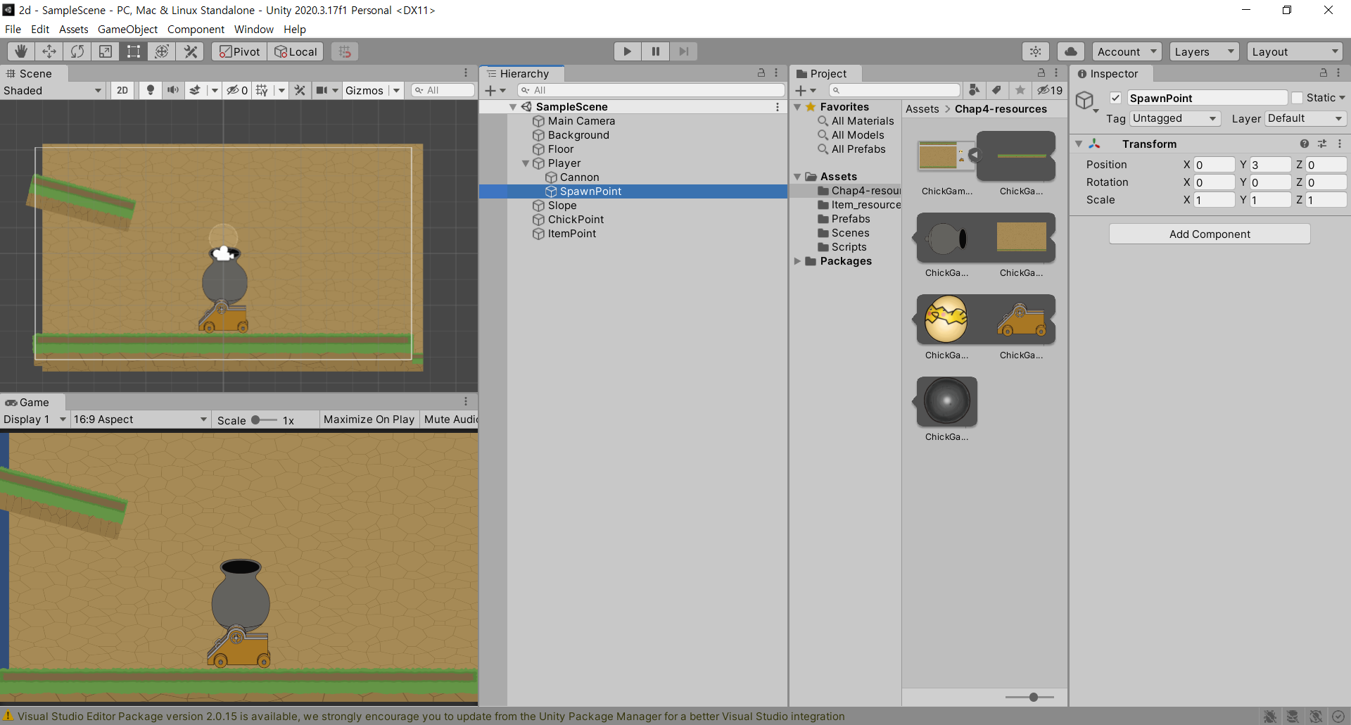 물체 충돌 검사 하기 add Tag를 해 ChickBall 태그를 추가한 후 적용시킨다. Item도 마찬가지로 태그를 추가한다. using System.Collections; using System.Collections.Generic; using UnityEngine; public class cshCannonBall : MonoBehaviour { // Start is called before the first frame update void Start() { } // Update is called once per frame void Update() { } private void OnCollisionEnter2D(Collision2D collision) // collision: 충돌된 물체 { if (c..
