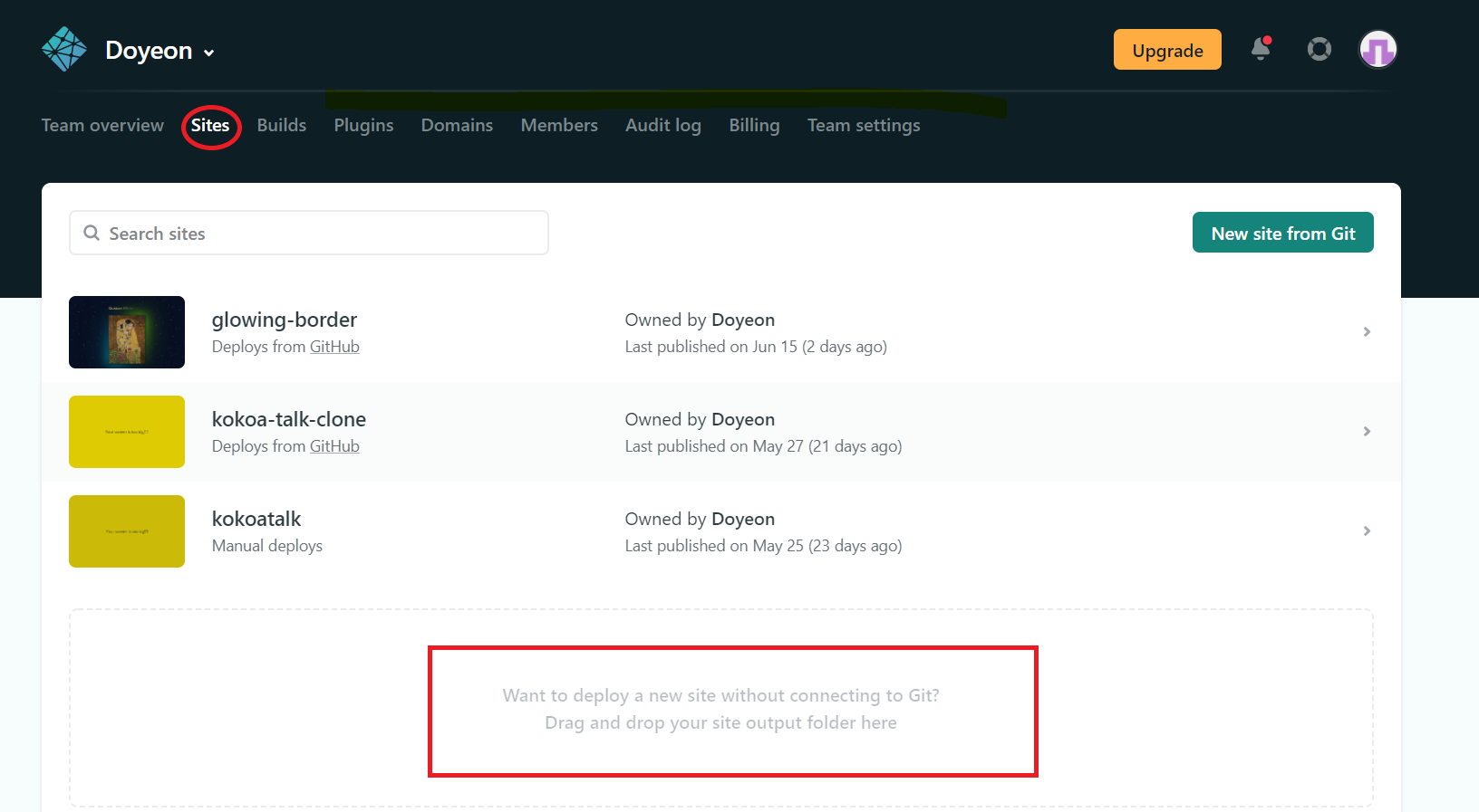 회원가입을 한 후, Sites 카테고리에 간 후 박스 부분에 원하는 프로젝트의 폴더를 드래그 합니다. deploy가 되고 이 창이 뜨면, site setting 버튼을 누릅니다. Change site name 버튼을 눌러 임의로 설정된 사이트 이름을 원하는 이름으로 바꿉니다. Bukld & deploy 카테고리의 Link site to Git 버튼을 누릅니다. GitHub를 선택합니다. 미리 깃허브 사이트에 만들어놓은 레퍼지토리를 불러오고, 선택합니다. 그대로 Deploy site을 누릅니다. 이렇게 하면 netlify와 github가 연동되어 수정사항이 있을 때 깃허브에 커밋만 하면 netlify 사이트를 업데이트 시킬 수 있습니다.